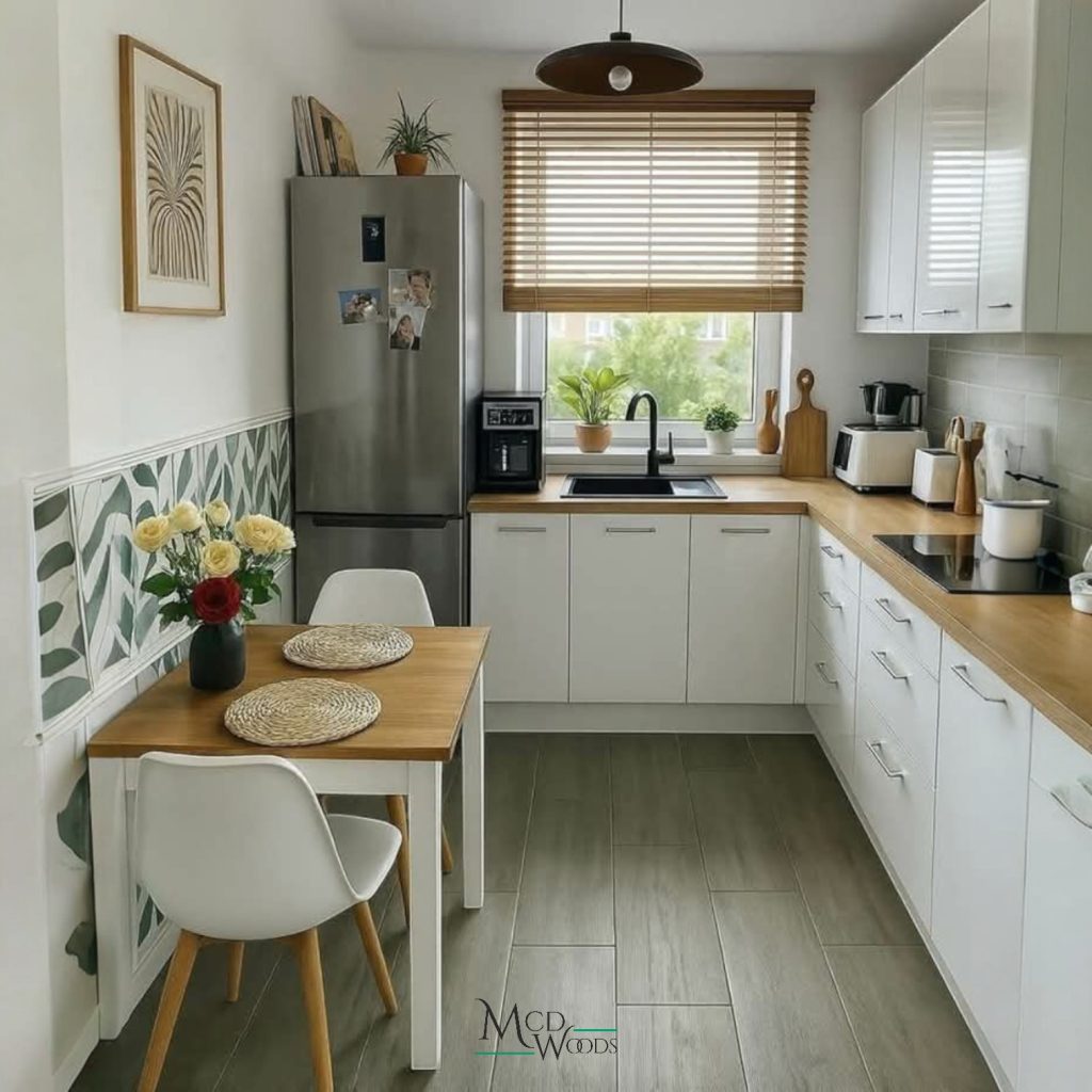 La superficie del comedor está fabricada con MDF de alta densidad, pintado en un elegante blanco satinado que aporta luminosidad y modernidad a cualquier cocina. Su acabado liso y resistente facilita la limpieza diaria y asegura una larga vida útil. -