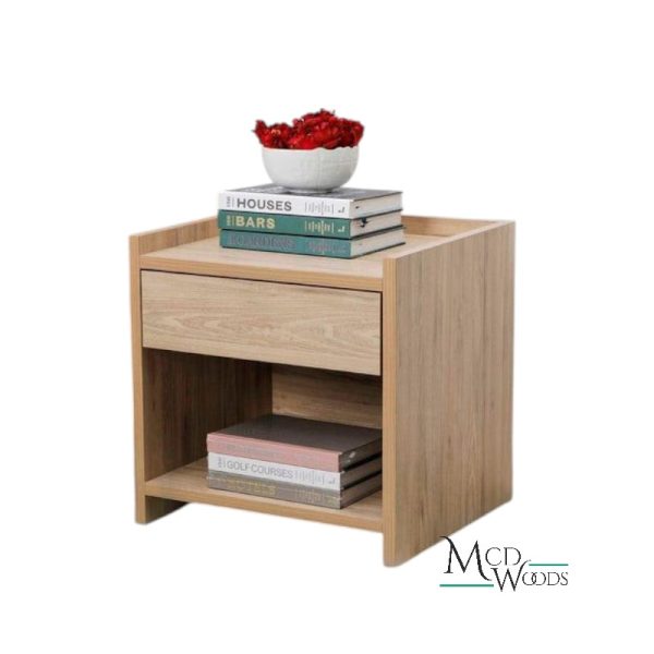 Esta mesa de noche combina estilo moderno y funcionalidad en una pieza compacta y elegante. Su cuerpo está fabricado en melamina con acabado madera, que aporta calidez visual y un toque natural al ambiente.