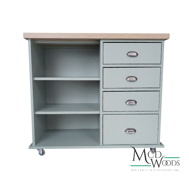 Una isla móvil de cocina es una pieza versátil y funcional que se adapta a diferentes necesidades y espacios. Con un diseño compacto y práctico, esta isla está equipada con ruedas, lo que permite moverla fácilmente por la cocina según se necesite. Su superficie de trabajo amplia ofrece un espacio adicional para preparar alimentos, mientras que sus cajones y estantes brindan almacenamiento extra para utensilios, ollas y otros elementos esenciales de cocina. El material es melamina de 18 y 36mm de espesor, con alta resistencia y durabilidad. Su movilidad la convierte en una opción ideal para cocinas de tamaño pequeño o medio, donde optimizar el espacio es esencial, pero sin renunciar a la funcionalidad y el estilo.