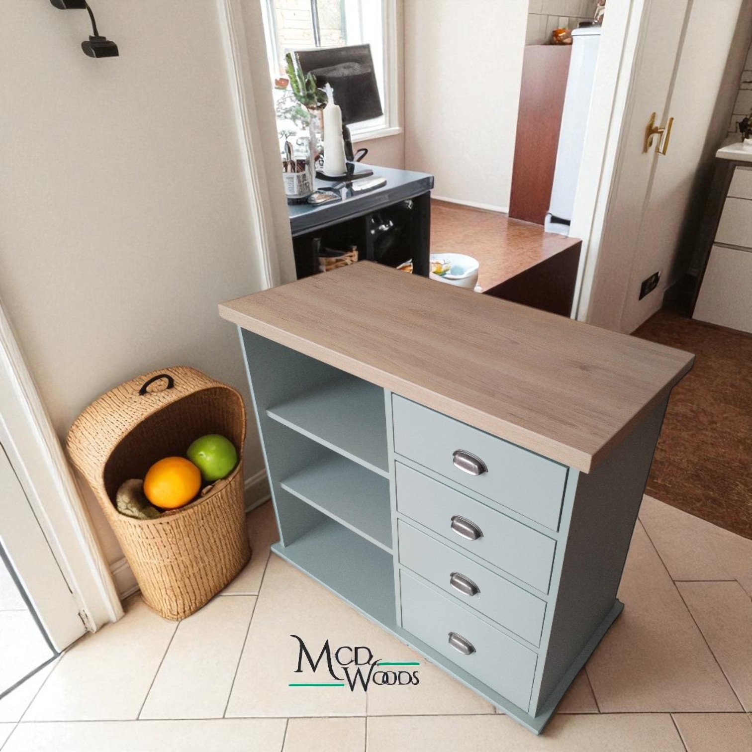 Una isla móvil de cocina es una pieza práctica y versátil, con ruedas para moverla fácilmente. Ofrece una superficie de trabajo adicional y almacenamiento extra en cajones y estantes, adaptándose a diferentes espacios y necesidades.