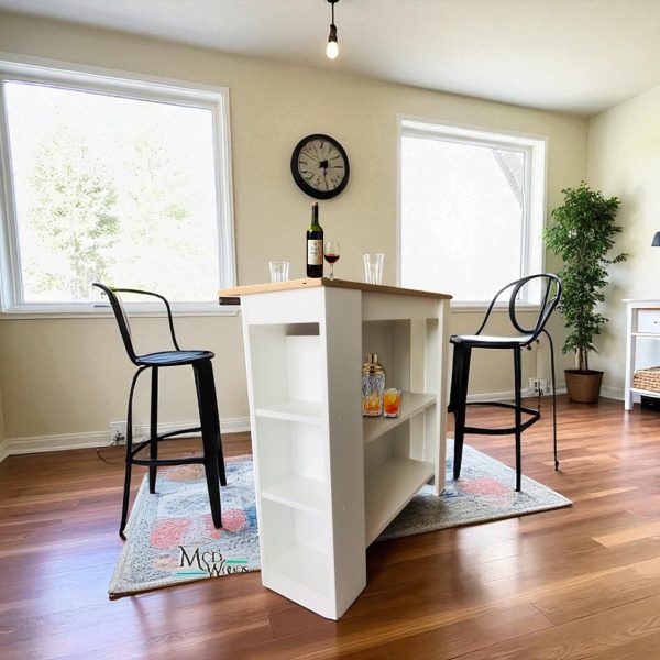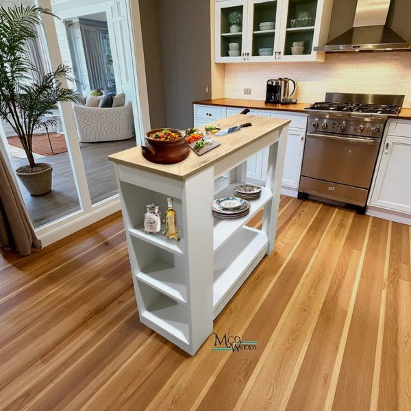 Equipada con repisas largas frontales y repisas laterales abiertas, ofrece amplio espacio para almacenar utensilios, recipientes o elementos decorativos, manteniendo la cocina organizada y con estilo. Su diseño versátil permite usarla como área de preparación, barra auxiliar o centro de trabajo.