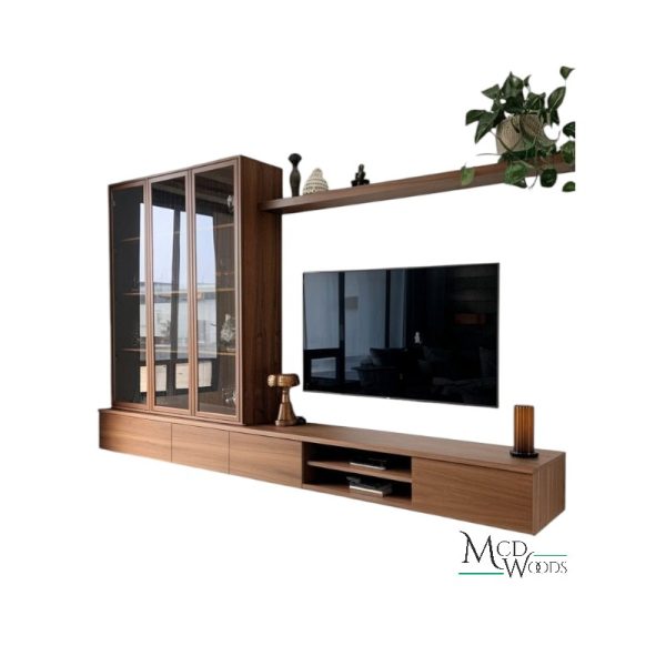 Este mueble de TV flotante combina líneas limpias con un detalle arquitectónico que lo distingue: un panel de palillaje decorativo ubicado en uno de los laterales, creando un contraste visual que aporta carácter y estilo al espacio.